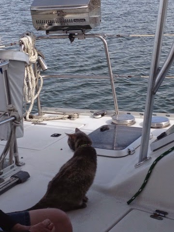 Amelia took an evening stroll into the cockpit. There's no grass out here, and she doesn't know what to think of that. She seems very interested in the dinghy. I'd say she was trying to abandon ship, but she sleeps through the engines, waves pounding under the bow and constant motion. We think she's going deaf, but also doesn't appear to get motion sick, even though she sleeps below the whole time! She loves to sleep in the sun, but it's constantly moving as the boat swings. It's taken awhile, but she's found ways to get up to see out the windows. She also now likes to play with string. Before she was too lazy to chase it around, but she's a boat cat now ;-)